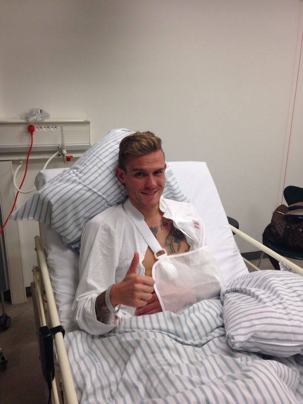Martin Vaculik po operacji obojczyka, złamanego podczas zawodów ligi duńskiej. Źródło: facebook.com/VaculikRacingTeam