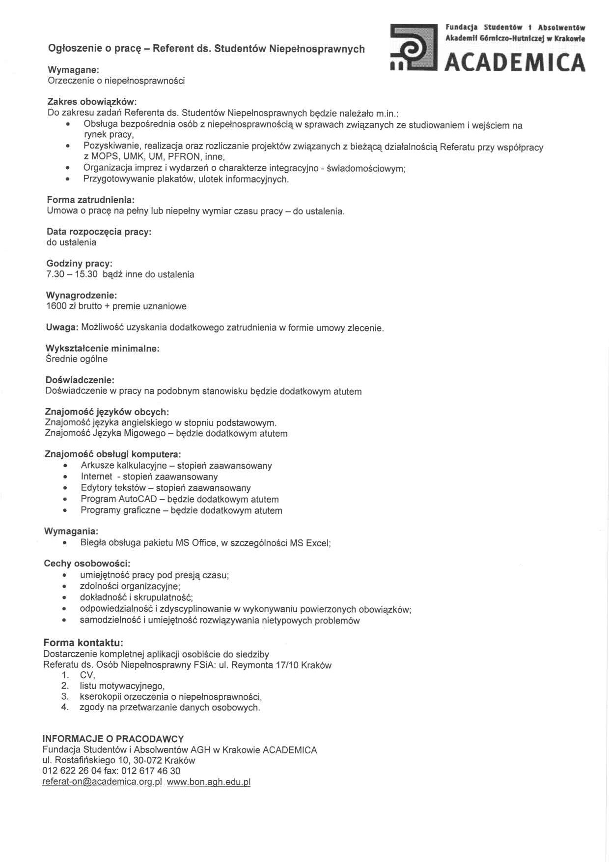 Oferta pracy FSiA ACADEMICA
